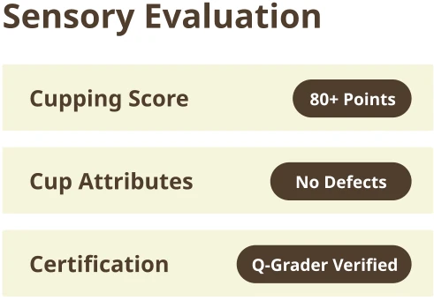 Multi level evaluation from farmer to export level by certified Q-graders using international standards.