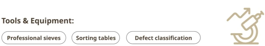 Foreign matters and defects must be under 8% through careful sieving and manual sorting.